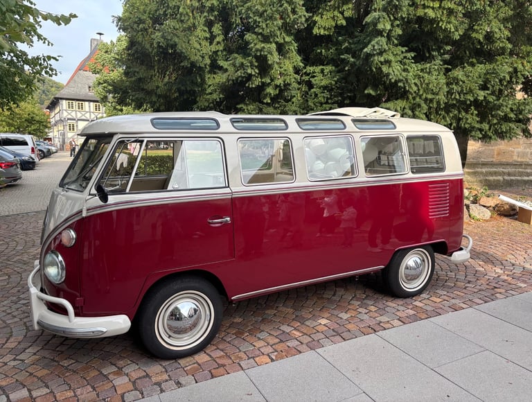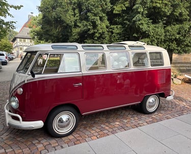 Unser originaler VW T1 Samba Bus aus dem Jahr 1967 ist der perfekte Begleiter für besondere Fahrten und Verantstaltungen, die unvergessliche Erinnerungen schaffen. Die Modellvariante Samba war die Luxusausführung unter den T1 Bussen - zu erkennen an den insgesamt 21 Fenstern und dem großen Faltschiebe-Panoramadach.