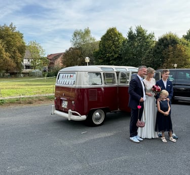 Unser VW T1 Samba Bus aus 1967 sorgt durch seinen Charme für eine ganz besondere Atmosphäre auf Ihrer Hochzeit oder Verantstaltung.